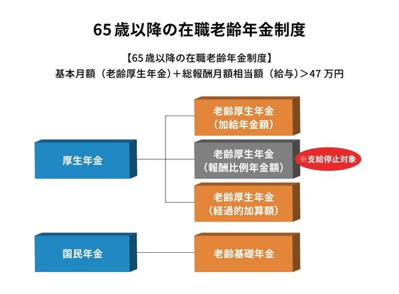 65歳以上の在職老齢年金制度(高在老)の中身は「年金と給与などの合計が月額47万円を超えれば、その間、年金の一部もしくは全額が支給停止となる」ものです。